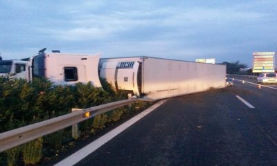 Un tir all'alba di oggi si è ribaltato sulla tangenziale; illeso il conducente, al lavoro i pompieri