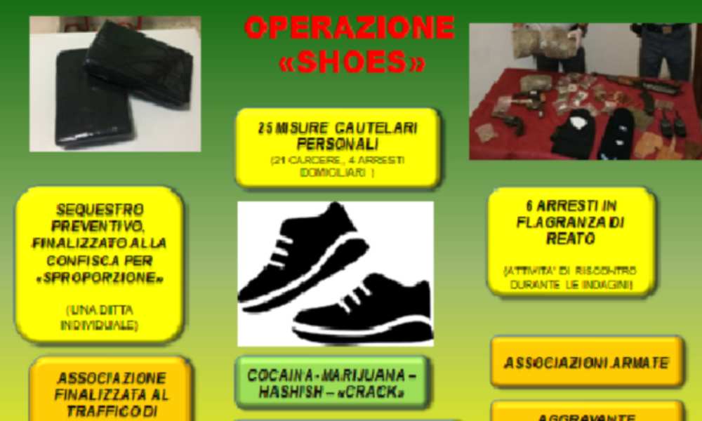 Tra il gennaio del 2017 e il novembre del 2018 i vari blitz messi a segno dalle forze dell’ordine hanno permesso di accertare che i vari fornitori campani, albanesi, calabresi e laziali avrebbero fatto giungere, sull’Isola, delle grosse quantità di droga da spacciare nella Sicilia orientale e che avrebbero fruttato fino a 2,5 milioni di euro. Nel maggio dello scorso anno è scattata scatta l’operazione “Stop and go” da parte della Guardia di Finanza che portò all’arresto di 16 persone, legate a due distinte organizzazioni criminali, aventi la loro base operativa a Catania con ramificazioni attive in Italia (Torino, Siena e Reggio Calabria) e all’estero (Spagna e Sud America). Ed è proprio dai risultati di quell’inchiesta che è partita l’operazione “Shoes”, la quale ha consentito di tracciare i traffici criminali di due associazioni armate, finalizzate al traffico di stupefacenti. Una delle due, secondo gli inquirenti, avrebbe avuto lo scopo di agevolare il gruppo “Ottantapalmi”, assorbito successivamente dai Nizza. I proventi illeciti sarebbero serviti per finanziare le famiglie dei detenuti.