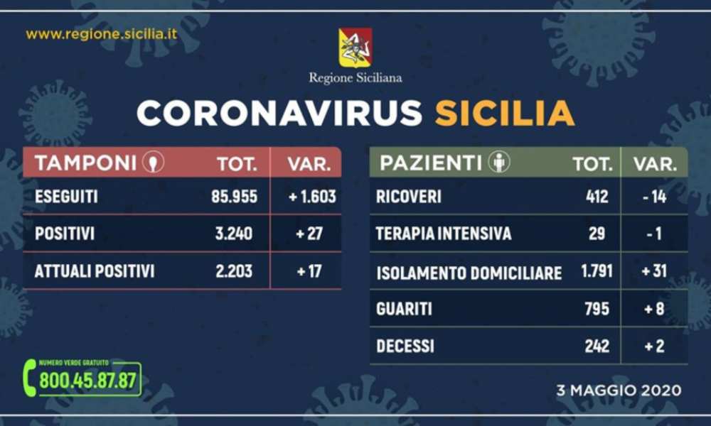 In Sicilia continua ad essere stabile la curva del contagio da Covid-19; scendono ancora i ricoveri e aumentano i guariti. Questo il quadro riepilogativo della situazione nell’Isola, aggiornato alle ore 15 di oggi così come comunicato dalla Regione Siciliana all’Unità di crisi nazionale. Dall’inizio dei controlli, i tamponi effettuati sono stati 85.955. Attualmente sono contagiate 2.203 (+17), 795 sono guarite (+8) e 242 decedute (+2). Degli attuali 2.203 positivi, 412 pazienti (-14) sono ricoverati – di cui 29 in terapia intensiva (-1) – mentre 1.791 (+31) sono in isolamento domiciliare. A Catania sono 688 i casi positivi (10 rispetto a ieri). Calano i ricoveri sono attualmente 88, meno uno rispetto ai dati di sabato. Sale il numero dei guariti dai 226 di ieri si passa ai 228 di oggi. Stabile quello dei decessi:86 le persone morte.
