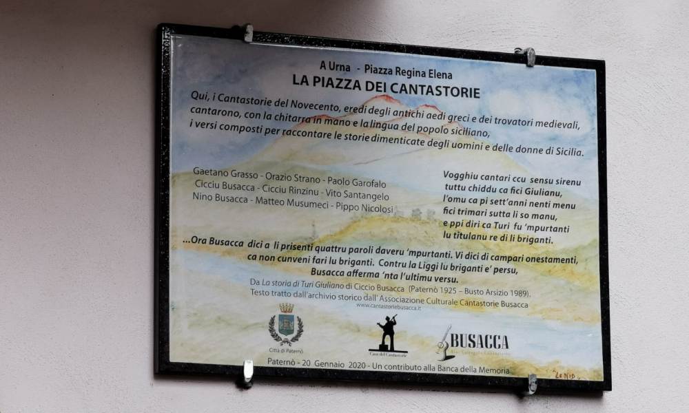 Per rendergli omaggio da questa mattina, in piazza Regina Elena, nota come “piazza Urna”, campeggia una targa in loro ricordo. Proprio in piazza Regina Elena, infatti, tra gli anni ’50 e ‘70 i cantastorie si esibivano, raccontando ai tanti cittadini che affollavano la strada, le loro storie. Presenti all’appuntamento, tra gli altri: il sindaco Nino Naso; il presidente del Consiglio comunale, Filippo Sambataro; Francesca Busacca; gli studiosi Mauro Geraci e Nino Tomasello; ed ancora Alessandro Nicolosi, responsabile del museo dei cantastorie; la presidente della Pro-Loco, Salvina Sambataro; il più giovane cantastorie d’Italia, il paternese Orazio Fusto; ed il maestro Barbaro Messina che ha realizzato la targa.