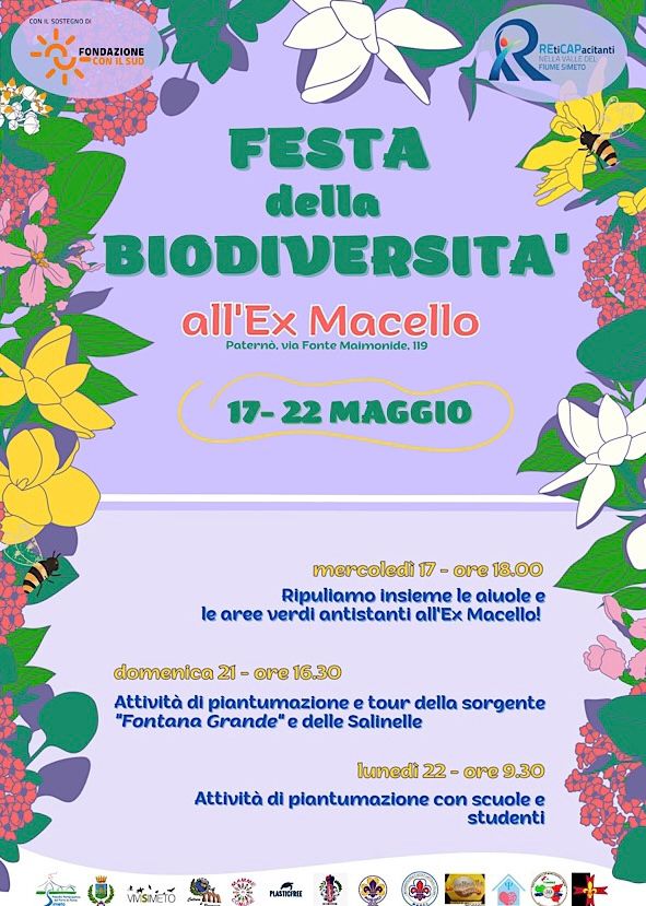 “Abbiamo deciso di organizzare la “Festa della Biodiversità” – dichiara Medea Ferrigno coordinatrice di ReCap (Reti Capacitanti) – coinvolgendo tutta la rete del Presidio Partecipativo, ed in particolare le associazioni e i residenti di Paternò, come un atto di cura dello spazio antistante l’ex macello. Da qualche settimana una parte dell’edificio è infatti diventata la sede del Presidio grazie ad un accordo con il Comune nell’ambito del progetto “ReCap Simeto” sostenuto da Fondazione CON IL SUD. Saranno giornate intense in cui confidiamo nella partecipazione attiva della cittadinanza al fine di ridare vita ad uno spazio quasi abbandonato che è invece un’area di particolare interesse sia storico che naturalistico”.