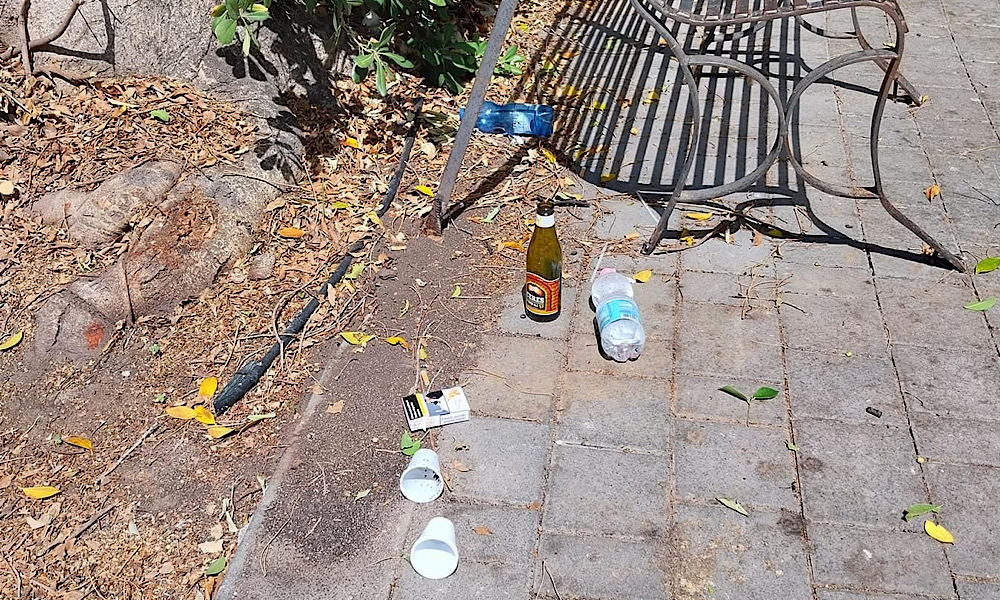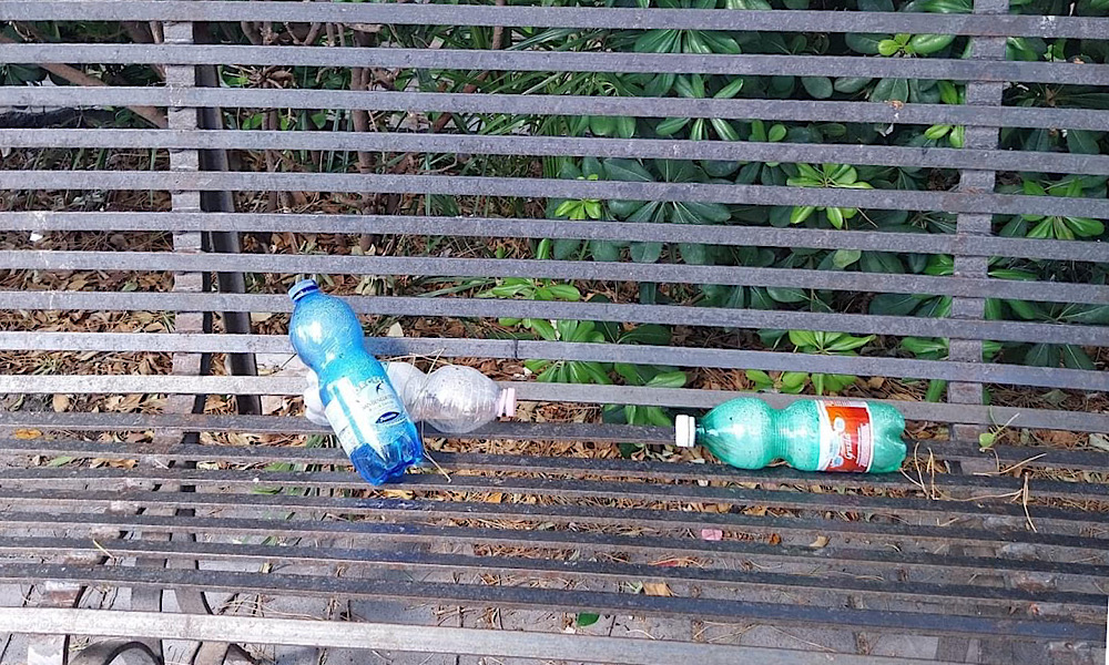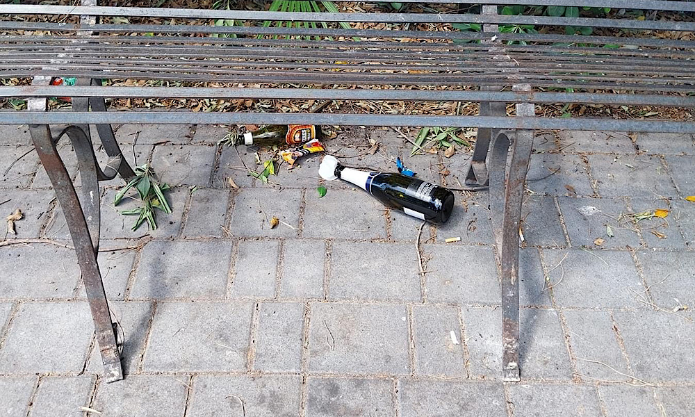 Lattine, bottiglie e bicchieri abbandonati sopra panchine e lungo i viali. Un cittadino ripulisce l’immondizia abbandonata ieri
