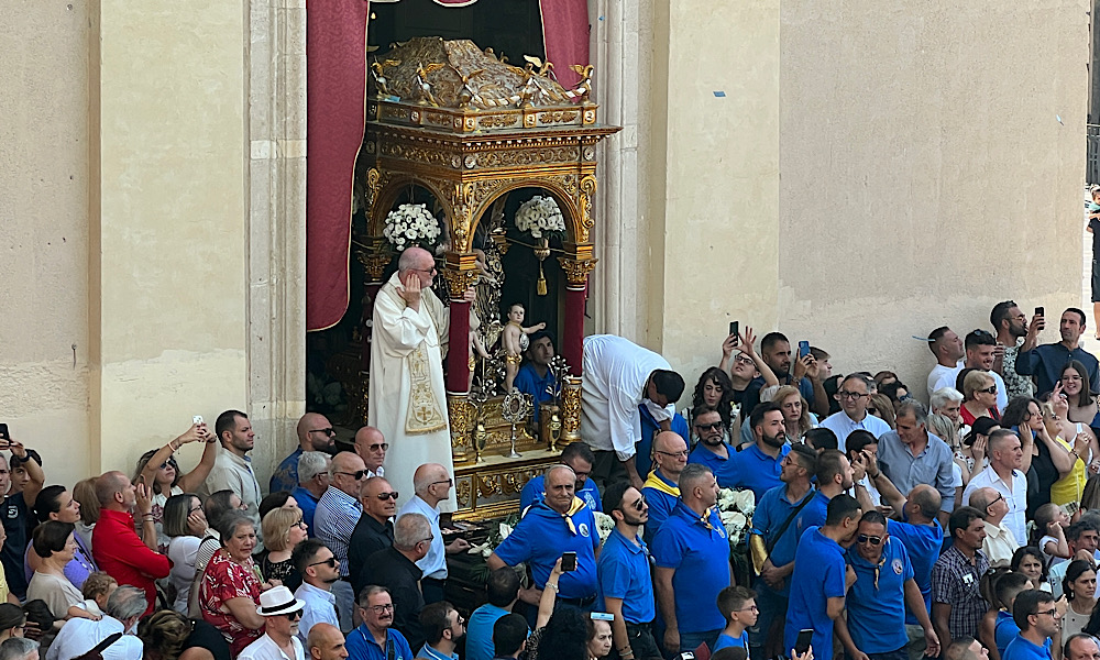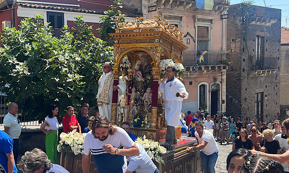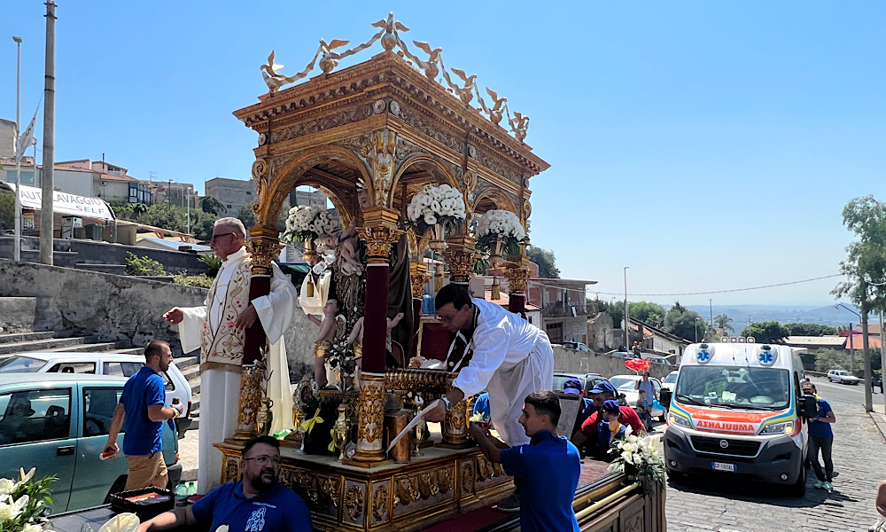 Giornata di grande festa, invece, quella di oggi domenica 27 agosto, con il giro interno del simulacro ligneo lungo le vie del centro storico del paese. A precedere l’uscita del fercolo su una gremitissima piazza Umberto I, è stata la Santa Messa celebrata dall’arcivescovo di Catania Luigi Renna, il quale ha toccato nella sua omelia diversi punti fondamentali sull’importanza della famiglia nel processo educativo dei figli – con diversi riferimenti ai fatti di cronaca avvenuti in questi giorni a Palermo –  cercando di proporre una chiave di lettura nuova alla luce dell’insegnamento della Santa Famiglia di Nazareth. Come di consueto, è stato poi il primo cittadino Giovanni Buttò a pronunciare il tradizionale messaggio augurale dal balcone centrale del palazzo comunale, rivolto alla cittadinanza. Particolarmente attesa la “cchianata de caseddi” con il fercolo in corsa e la benedizione dei bambini a piazza Torino con l’atto di affidamento al Santo. Ad animare la festa, le musiche della banda licodiese “Giovanni Pacini” e i tamburi imperiali di Militello Val di Catania.